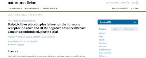 11月4日,国际四大医学期刊之一、英国《自然》旗下《自然医学》(Nature Medicine)在线发表CDK4/6抑制剂达尔西利(SHR6390)联合氟维司群治疗既往内分泌治疗后疾病进展的HR+/HER2-晚期乳腺癌的多中心、随机、双盲III期临床研究(DAWNA-1研究)中期分析结果报告,首次对氟维司群(雌激素受体降解剂)±达尔西利治疗激素受体阳性晚期乳腺癌的有效性和安全性进行了比较。研究结果显示,达尔西利+氟维司群组与安慰剂+氟维司群组相比,无进展生存期(PFS)显著延长。该项研究由中国医学科学院肿瘤医院徐兵河教授担任leading PI,全国39家医院参研,由开云体育医药临床研发团队支持完成。