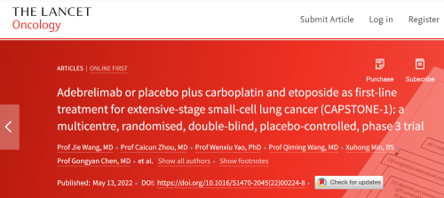 北京时间2022年5月14日,开云体育医药自主研发的PD-L1抑制剂阿得贝利单抗治疗广泛期小细胞肺癌的III期临床研究(CAPSTONE-1研究)成果正式全文在线发表于国际权威学术期刊《柳叶刀·肿瘤学》(《THE LANCET Oncology》,影响因子41.316)。CAPSTONE-1研究结果显示,阿得贝利单抗联合化疗一线治疗广泛期小细胞肺癌相较于安慰剂联合化疗可以显著延长患者总生存期至15.3个月[1],刷新现有免疫药物一线治疗广泛期小细胞肺癌的总生存纪录[2]。