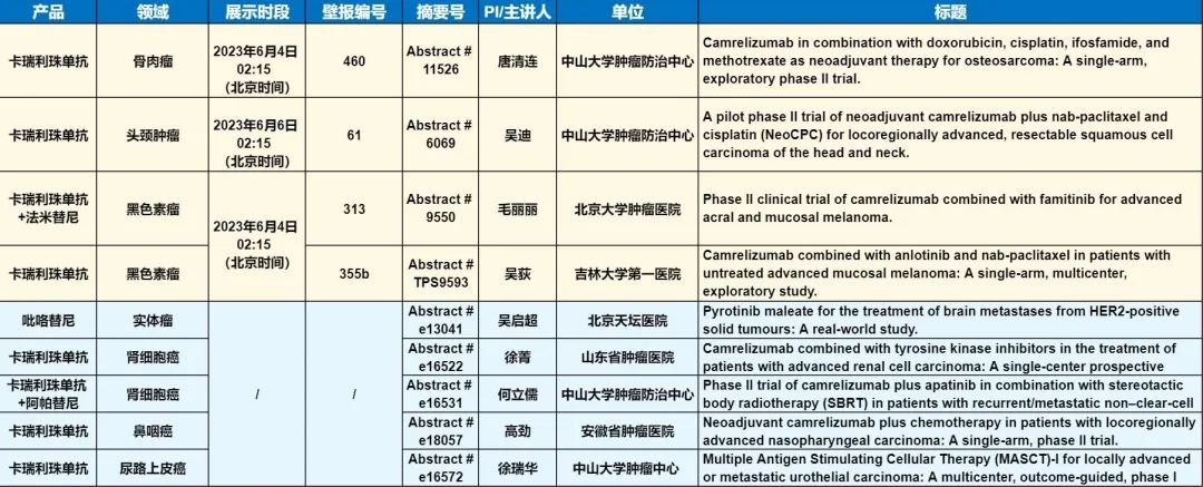 此外,在头颈肿瘤、黑色素瘤、骨肉瘤、鼻咽癌、肾细胞癌、尿路上皮癌等多个领域,卡瑞利珠单抗、吡咯替尼等产品相关研究一共入选了4项壁报展示和5项线上发表,彰显了开云体育医药强大的自主研发综合实力。