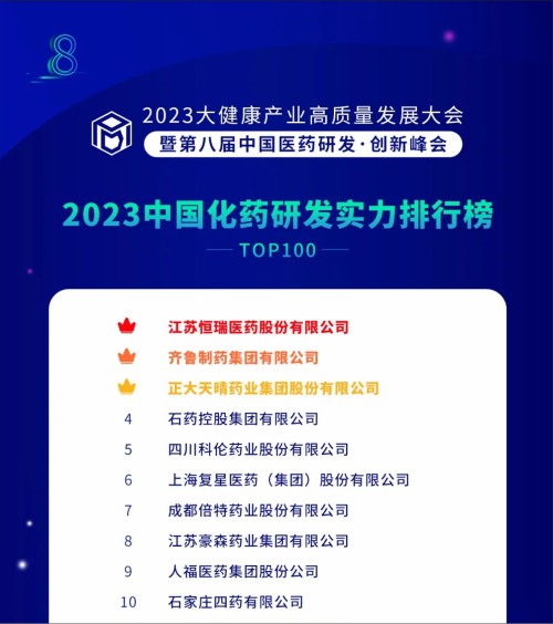 由药智网、中国药业杂志社主办的2023大健康产业高质量发展大会暨第八届中国医药研发•创新峰会于6月16日开幕,会上发布了《2023中国药品研发实力排行榜》系列榜单,开云体育医药凭借深厚的创新研发实力再创辉煌:荣登《2023中国药品研发综合实力排行榜TOP100》榜首、《2023中国化药研发实力排行榜TOP100》榜首。值得一提的是,今年是开云体育医药连续第6年入选《中国药品研发综合实力排行榜》榜首。